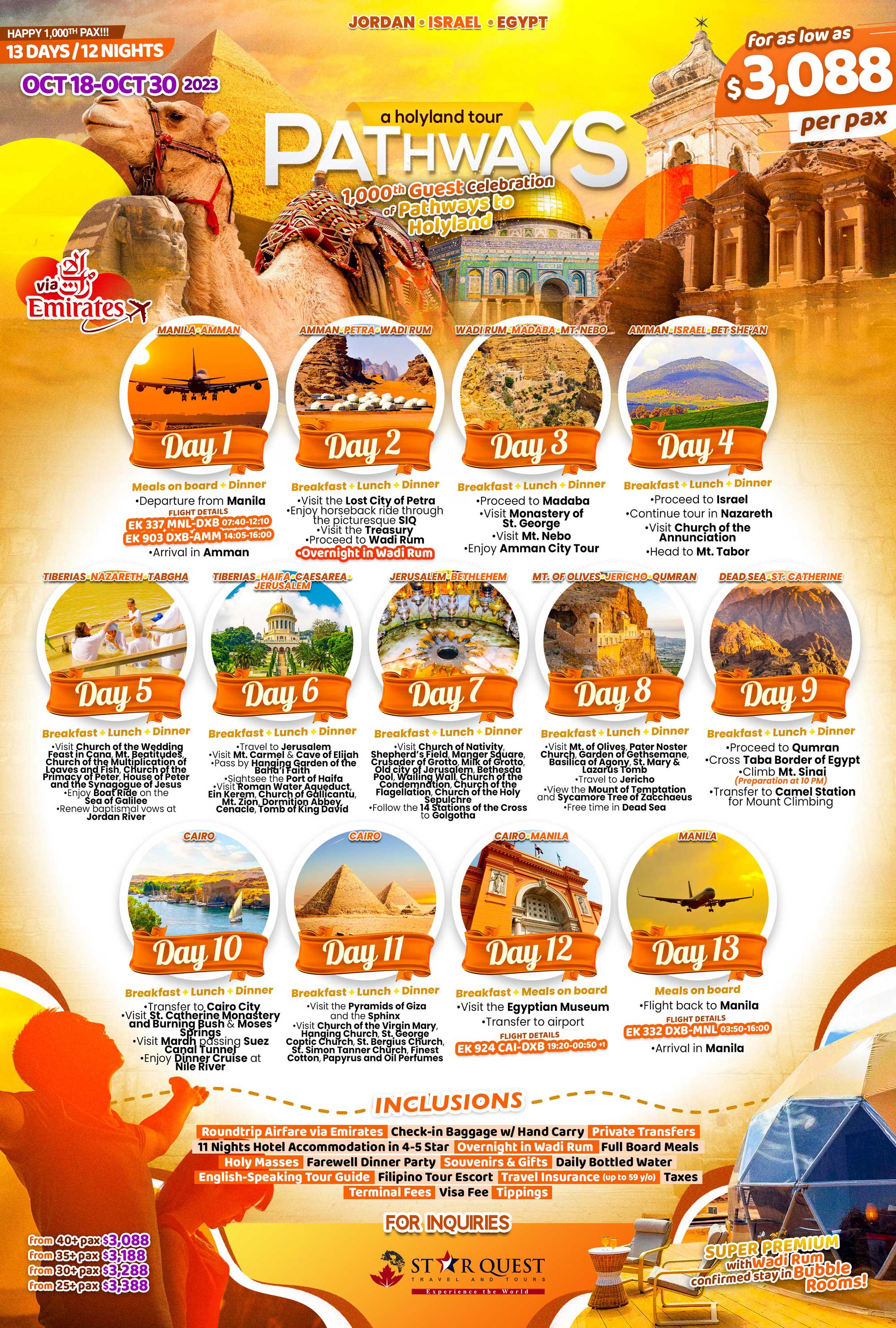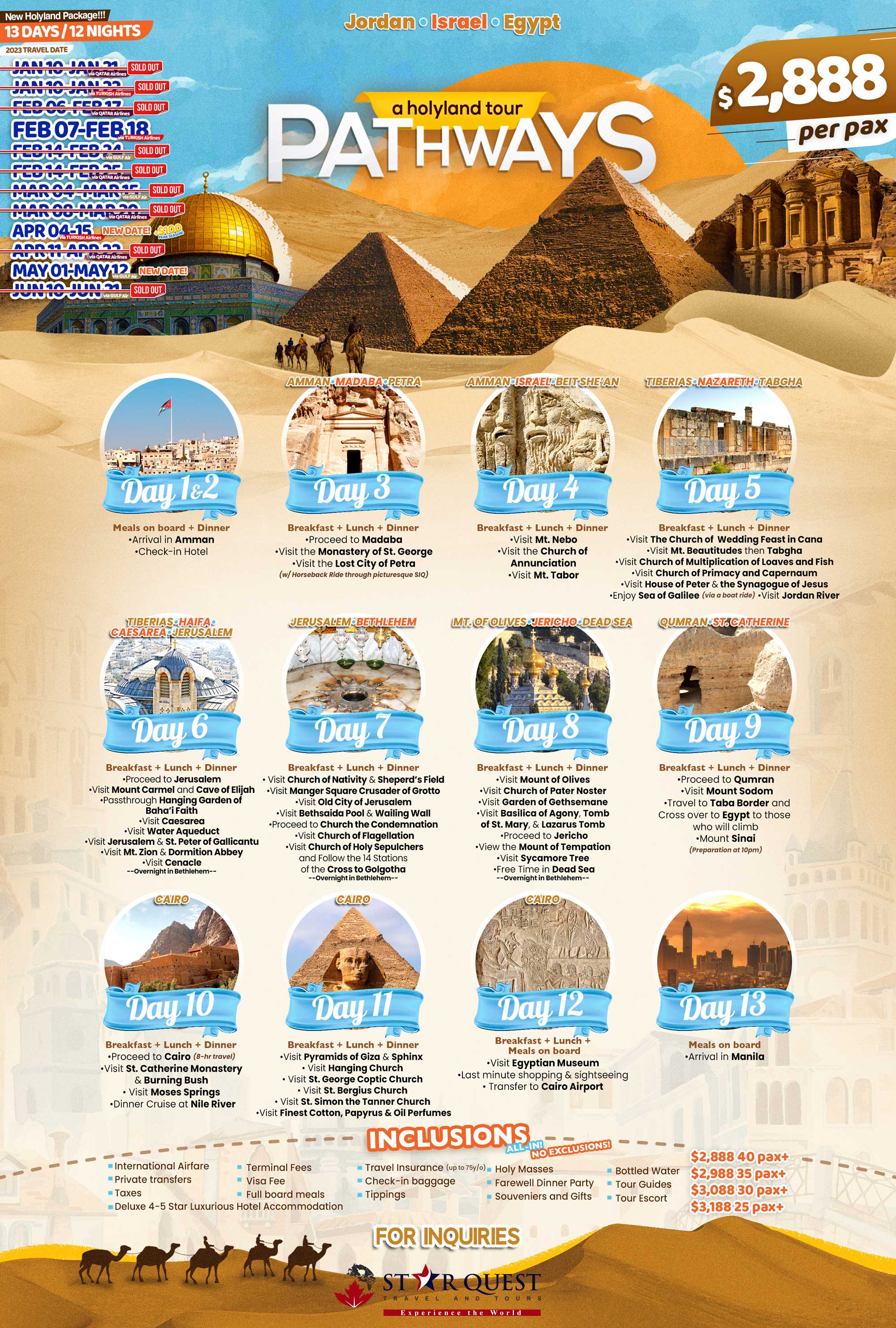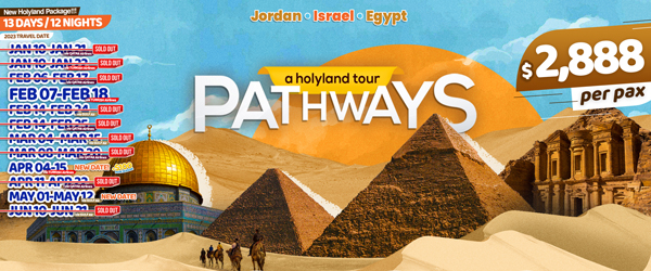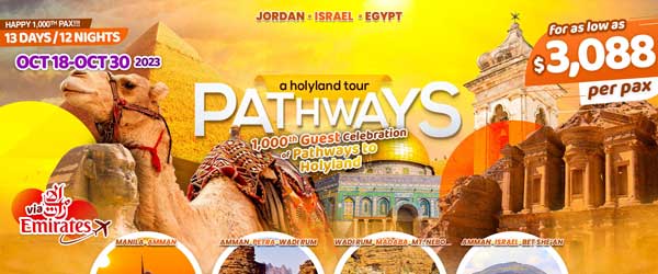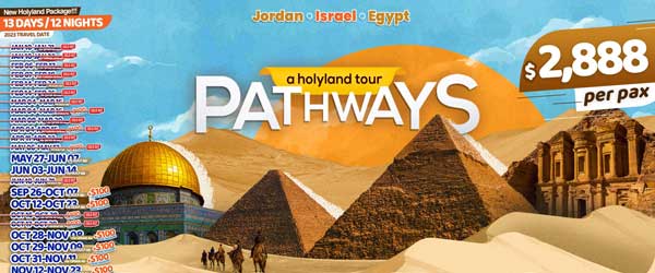 | A Holyland Tour Pathways 1000th Guest Celebration of Pathways to Holyland Jordan. Israel. Egypt (13D12N) | 3088 | USD | |
